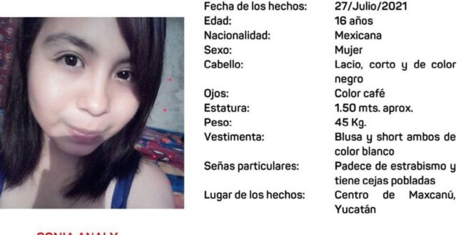 MÉRIDA, Yuc., 31 de julio 2021.- Desde el pasado martes 27 de julio, la adolescente Sonia Analy Canul Reyes, de 16 años de edad, se encuentra desaparecida.