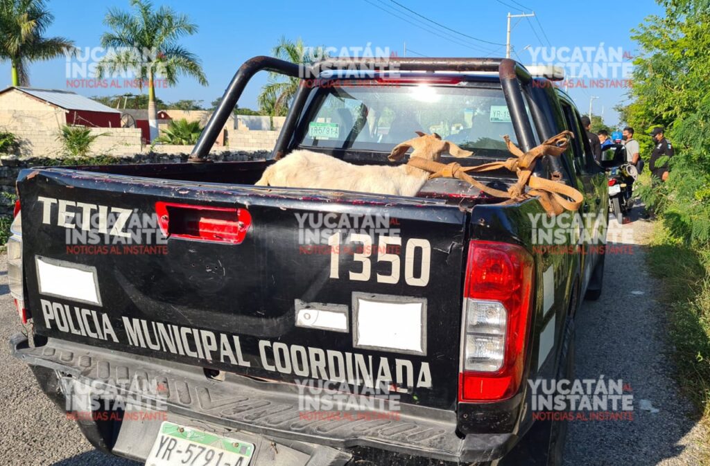 Tetiz, Yuc., 13 de diciembre 2021.- En un accidente curioso, una cabra llamada Lupe, se llevó el show en la vía Tetiz-Nohuayún, pues al atravesarse a su paso de un motociclista, este atropelló al animal que quedó inconsciente debajo de un vocho, para derrapar. Pero acabó recobrando fuerzas del golpe para ser ‘arrestada’ por la Policía Municipal.