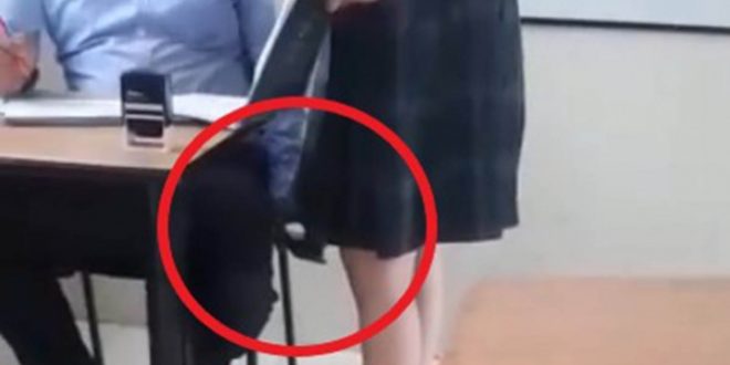 El video, difundido en redes sociales por sus alumnos, muestra al profesor sentado en su escritorio mostrando algo a una de sus alumnas, momento que aprovecha para grabar debajo de su falda.