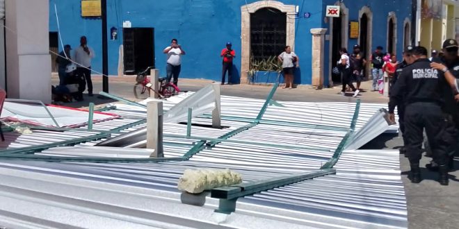 TIZIMÍN, Yuc., 21 de marzo 2025.- Daños materiales, y una mujer con golpes y lesiones, además del susto de decenas de personas fue lo que dejó la caída de una estructura metálica en el Centro de este municipio, lo cual puso a trabajar de inmediato a los servicios de emergencias.