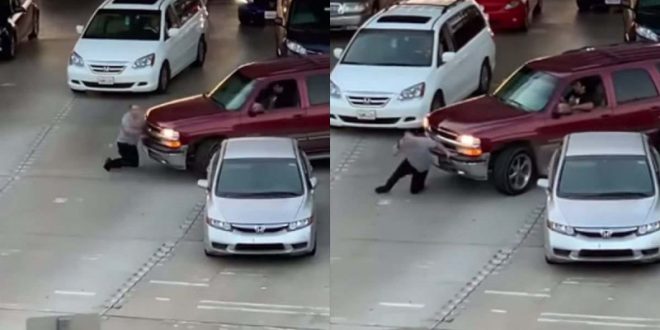 La persona con el celular quedó de rodillas y el chofer de la camioneta lo embistió. Aún así esta persona no se quitó y nuevamente recibió otro empellón.