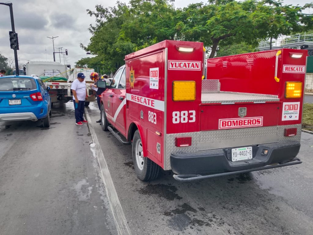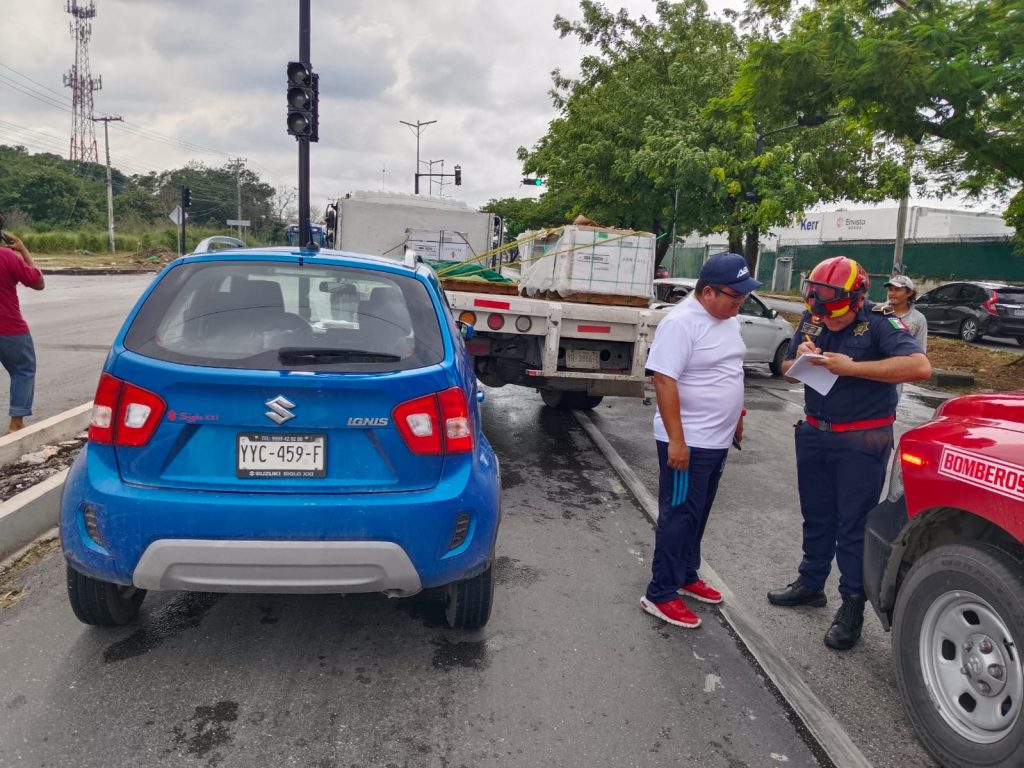 Y es que el conductor del camión tipo plana de una empresa de pisos de cerámica, por ir a exceso de velocidad sobre la peligrosa vía a Umán, no pudo frenar a tiempo cuando la luz del semáforo cambio a rojo, haciendo que todos los vehículos se detuvieran.