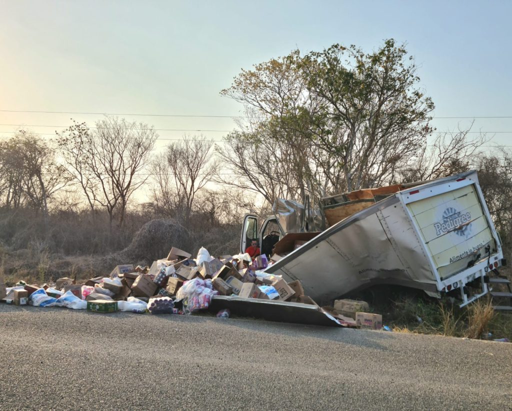 Kinchil, Yuc., a 11 de mayo 2024.- Una persona lesionada y un regadero de mercancía fue el saldo de la volcadura de un camión de abarrotes, en el marco de los festejos al Día de las Madres, suscitada en la vía Kinchil – Celestún.