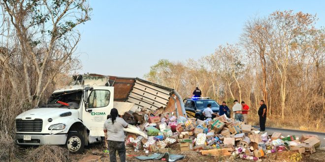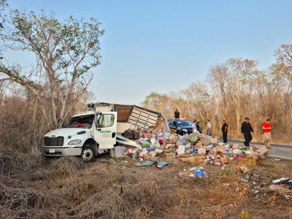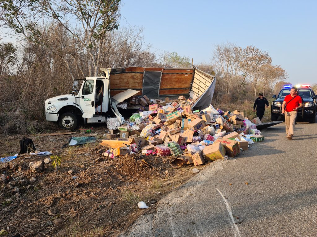 Kinchil, Yuc., a 11 de mayo 2024.- Una persona lesionada y un regadero de mercancía fue el saldo de la volcadura de un camión de abarrotes, en el marco de los festejos al Día de las Madres, suscitada en la vía Kinchil – Celestún.