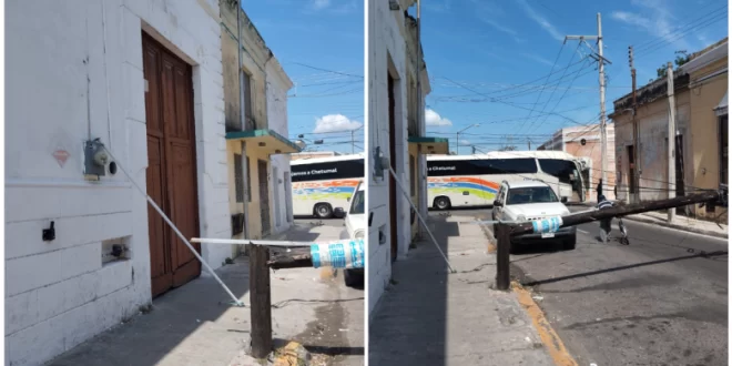 MÉRIDA, Yuc., 22 de abril 2025.- Un camión de pasajeros ocasionó que un poste una compañía telefónica quedara partido en dos luego de que la unidad jaló unos cables a baja altura.