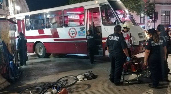 MÉRIDA, Yuc., 28 de septiembre de 2019. Un adulto mayor que intentó cruzar la calle con su bicicleta agarrada fue embestido por un camión urbano en el centro de Mérida, y de milagro salvo la vida.