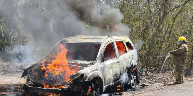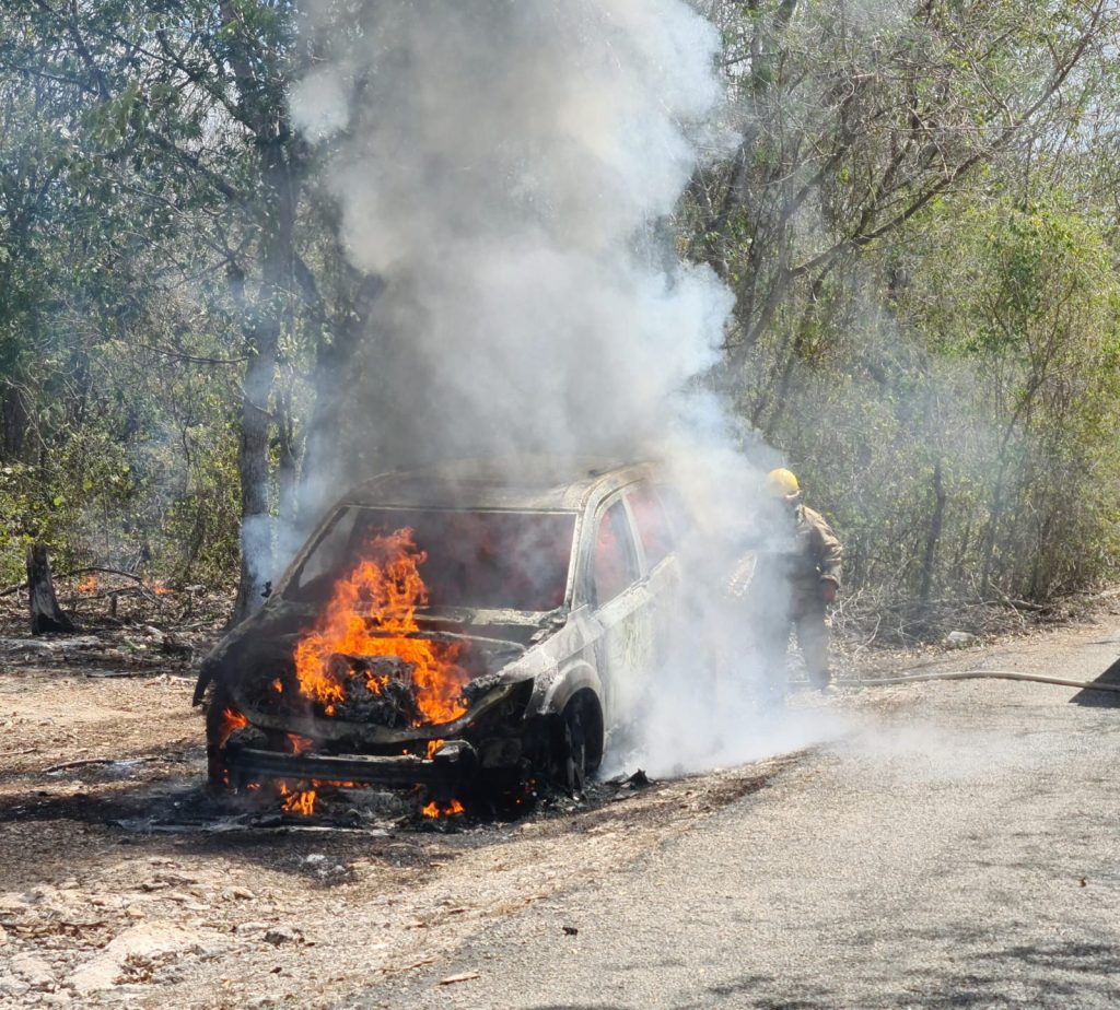 KINCHIL, Yuc., 29 de febrero 2024.- Un voraz incendio de una camioneta Dodge Journey se suscitó poco antes de este mediodía en el antiguo camino que comunica este municipio con Tedzidz.