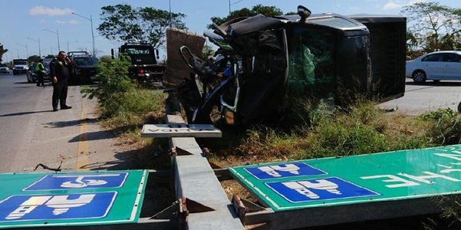 El vehículo se salió de la cinta asfáltica por la derecha y se estrelló de frente contra el poste de un señalamiento de bandera, que derribó desde el cimiento; además, volcó sobre su costado izquierdo. Ambos salieron heridos. Información Megamedia