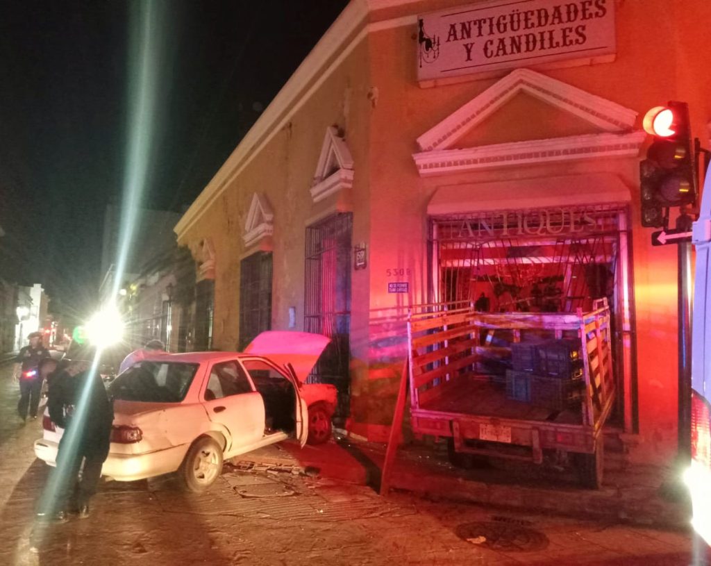 MÉRIDA, Yuc., 21 de noviembre 2024.- Un fuerte accidente se suscitó en las primeras horas de este jueves en el mero Centro de esta ciudad, entre dos vehículos que terminaron con sus buenos daños, además de que uno de estos finalizó dentro de un comercio.