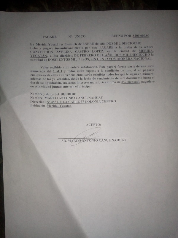 Asimismo, la afectada mencionó que ya transcurrido todo el 2017 y al no ver respuesta alguna, acudió a su oficina el pasado 17 de enero del 2018, ubicada en la calle 37 del centro de Mérida, y de “sorpresa” pudo encontrarlo “se le obligó a firmar una hoja, donde se comprometía a liquidar el total de la deuda el cual es 200 mil pesos, o en su caso de no pagar el total pagaría un interés moratorio de 6 mil pesos mensuales, mismos que ha pagado de poco en poco, pero la deuda total ni un peso”