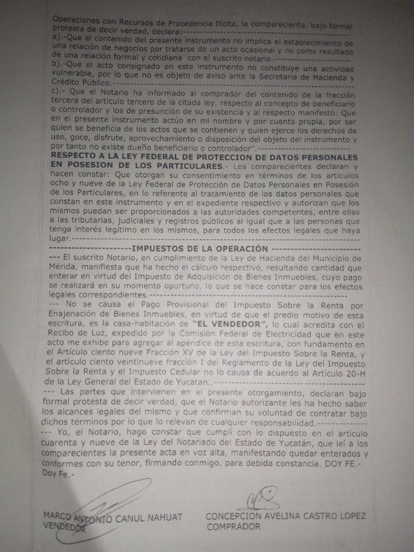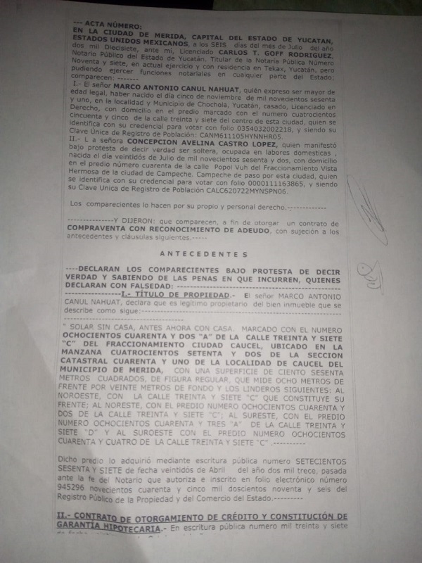 La campechana, explicó que el pasado 6 de julio del 2017, fue el día en que se llevó a cabo la firma ante el notario público de nombre Hugo Wilberth E. B. “de ahí empezaron las trabas del ‘abogado’ quien dijo después de signar en el documento, que las llaves de la propiedad y escrituras me las entregaría en días posteriores, que a la fecha no lo ha realizado”, relató la afectada