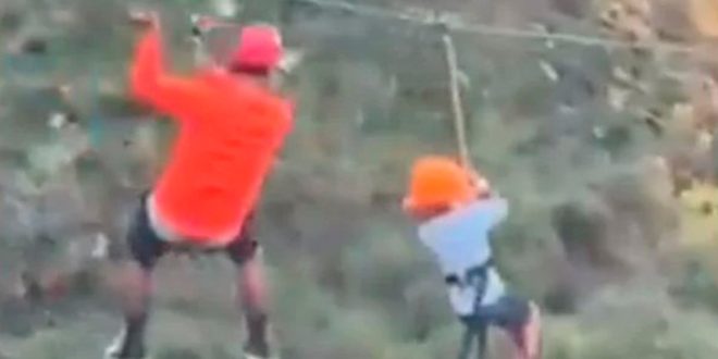 Poco a poco el impulso del niño fue perdiendo fuerza hasta ser alcanzado por el hombre, quien se pegó a él a la mitad del trayecto, con el único fin de auxiliarlo para llegar hasta el otro lado de la tirolesa.