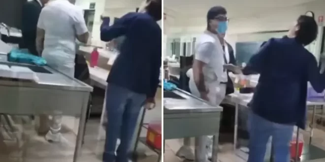 La doctora continúa pidiendo respeto, ya que los insultos suben de todo. Asimismo, pide que “le baje” o le va a soltar un golpe. “Pégame, pégame”, dice el hombre. En ese instante, le suelta un manotazo. Luego el enfermero intentó regresarle el golpe pero su mano se detuvo en el aire. Los insultos continuaron hacía su compañera.