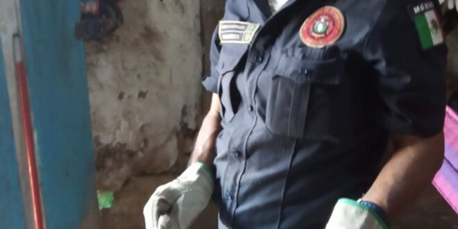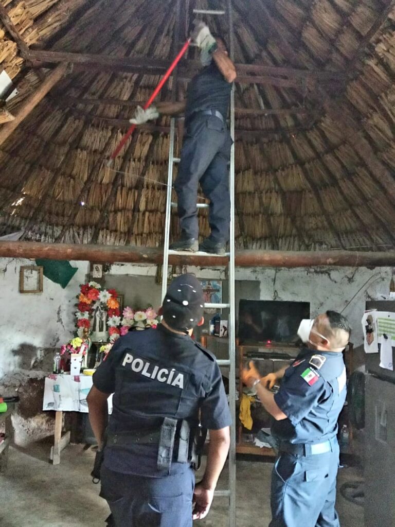 Ante el reporte personal del cuerpo de Bomberos del carropipa 843 de la SSP, hicieron las labores de rescate para bajar el reptil que estaba en el techo de la humilde morada situada por la calle 21 entre 24 y 26 de este pueblo. Los uniformados estatales procedieron a trasladar en el monte a esta serpiente que a veces es muy común encontrar en los solares de esta comunidad.