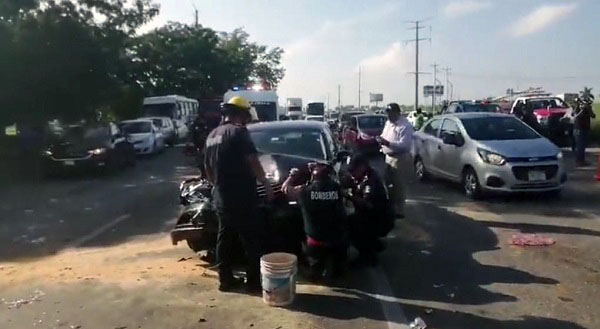 De acuerdo a los primeros reportes indican que el guiador de un tráiler se intentaba maniobrando para ingresar a un negocio ubicado en esa zona, lo que provocó que el conductor de un Versa diera el frenón para evitar estamparse por alcance contra la pesada unidad, pero otro vehículo tipo Vento no alcanzó a frenar y sobrevino el impacto, y de manera sucesiva una camioneta Chevy completó la carambola.