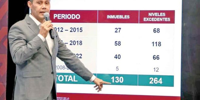 Detalló que de 2008 a 2011 se edificaron cinco inmuebles con 12 pisos de más; de 2012 a 2015, 27 inmuebles con 68 extras; de 2016 a 2022, 58 inmuebles con 118 pisos excedentes; y de 2019 a 2022, 40 inmuebles con 66 niveles irregulares.