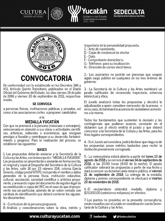 LEER MÁSSe busca a la o el próximo recipiendario de la Medalla Yucatán 2018
