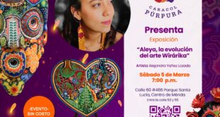 Mérida, Yucatán, a 21 de febrero del 2022.- Galería Caracol Púrpura Mérida tiene el honor de invitar a todo el público a la inauguración de la exposición temporal de la artista Alejandra Yáñez Lozada denominada “Aleya, la evolución del arte Wirarika”, así mismo al curso que impartirá la misma artista …