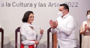 _Reconoce el Cabildo la amplia trayectoria y sus contribuciones a la cultura de la artista Ofelia Medina_ Mérida, Yucatán a 7 de enero de 2022.- El Alcalde Renán Barrera Concha entregó esta noche la Medalla Silvio Zavala a la Cultura y las Artes 2022 a la dramaturga Ofelia Medina, como …