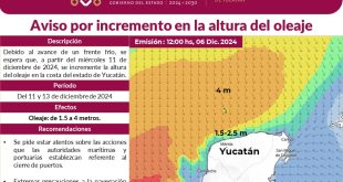 · Gobierno del Estado, a través de la Coordinación Estatal de Protección Civil (Procivy) informa que, a causa de la masa de aire frío que impulsa a este Frente Frío, tendremos un descenso de las temperaturas a partir del viernes 13 de diciembre, con registros mínimos de 11 a 13°C …