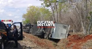 Corresponsalías/Yucatán al Instante Maxcanú, Yuc., 3 de mayo.- Una desperfecto mecánico ocasionó que un tractocamión que transportaba 20 tonelada de alimentos para caninos, volcara la tarde de ayer en la vía federal Mérida- Campeche. Los hechos se suscitaron a la altura del kilómetro 101, de mencionado tramo, cuando Ignacio Luna …