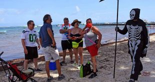 CANCÚN.- Ahí viene… es un sujeto vestido con un disfraz de calaca. Se acerca a grupos de turistas que llegan a Puerto Morelos, para advertirle de los riesgos latentes por el Covid-19. Puerto Morelos se encuentras en semáforo naranja. Está prohibida la apertura de playas, pero… la gente llega. Quintana …