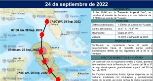 Sigue su curso hacia el poniente de Cuba y sur de Estados Unidos, y del 26 al 27, aportaría lluvias de ligeras a fuertes. – Este domingo 25, inicia temporada de frentes fríos, con el pronóstico de que entre 28 y 30 ingresarán a la Península. Mérida, Yucatán, 24 de septiembre …