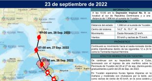 Con dirección hacia Cuba y Florida, podría volverse tormenta, durante las próximas horas. – Enrique Alcocer Basto pide a la población mantenerse informada por los canales oficiales. Mérida, Yucatán, 23 de septiembre de 2022 (16:00horas). – Un sistema de baja presión en el Mar Caribe originó, esta madrugada, la depresión …