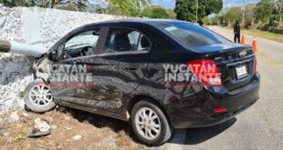 Corresponsalías/ Yucatán al Instante Tetiz, Yuc., 20 de enero 2022.- Contra un pilote de Telmex, acabo reventándose esta mañana el guiador de un automóvil Beat, tras estallar un neumático y causar que pierda el control en la vía federal Tetiz-Hunucmá. El conductor quien es vecino de Tetiz, pariente de “Wawis”, …