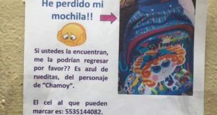 Ayuda. S.O.S. Un pequeño perdió su mochila. Un emoticón con cara de preocupación acompaña la alerta que empieza a viralizarse en redes sociales. Camión vuelca en deprimido de Mixcoac y desquicia la vialidad La mochila es de color azul, con rueditas y el personaje de ‘Chamoy’. De acuerdo con la …