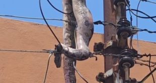 Federico Azul/ Yucatán al Instante Mérida, Yuc., 17 de agosto 2024.- Una boa que subió a un poste de la CFE de la calle 52 entre 67 con 69 del centro de Mérida terminó electrocutada y causando corto circuito en el sistema eléctrico y dejando sin energía a comerciantes de …