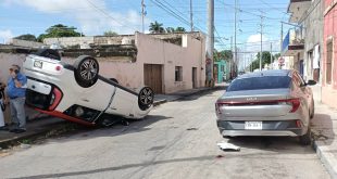 Federico Azul/ Yucatán al Instante Mérida, Yuc., a 6 de julio 2024.- Con los neumáticos arriba y sobre de la banqueta quedó un automóvil tipo Kia Soul luego de impactarse contra otro Kia estacionado en la calle 46 entre 57 y 59, cerca del Centro de esta ciudad. Por si …
