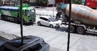 Una cámara de vigilancia captó el momento en que un vehículo fue aplastado en su totalidad por un camión contra una mezcladora de cemento. Por fortuna, los dos pasajeros en el vehículo sobrevivieron a este increíble accidente. El incidente tuvo lugar en una ciudad de la provincia de Fujian, al …