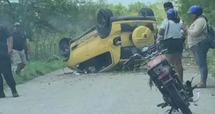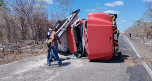 Federico Azul/ Yucatán al Instante Kinchil, Yuc., a 4 de junio.- Vuelve a ser noticia el tramo salado de la Kinchil-Celestún, al suscitar una aparatosa voladura de un camión de volteo al “pellizcar” el borde del pavimento, a altura del kilómetro 50+500, La tarde de ayer Ricardo Omar Cetz Cahuich …