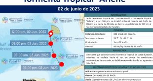 – Como remanente, Procivy anticipó para mañana vientos del norte de 20 a 30 km/h, lluvias ligeras en el norte del estado y oleajes de 1.12 a 1.5 metros. – Con “Arlene” inició puntual la temporada de ciclones; estamos preparados para minimizar riesgos y salvaguardar a la población: Alcocer Basto …