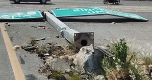 Federico Azul/ Yucatán al Instante Kinchil, Yuc., 9 de mayo 2023.- Un enorme poste de metal tipo bandera fue ‘tumbado’ la madrugada de este lunes por una pesada unidad, cuyo conductor como pudo huyó despavorido al ver el lío en que se había metido, justo del entronque del libramiento Kinchil-Tetiz. …