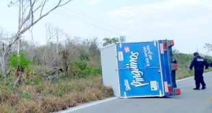 Federico Azul/ Yucatán al Instante Celestún, Yuc., a 8 de mayo.- Una camioneta repartidora de Marinela terminó volcada este lunes en la peligrosa vía del tramo Celestún-Kinchil, exactamente a la altura del kilómetro 75. Según se averiguó el conductor de esta unidad con caja cerrada identificado por sus colegas como …