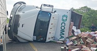 Federico Azul/ Yucatán al Instante Kinchil, Yuc., 24 de junio de 2022.- El tramo que conecta al puerto de Celestún, registró otra volcadura de un camión torton de la empresa surtidora COMA que transportaba más de 11 toneladas de abarrotes. La vía federal Mérida-Celestún, en específico el trecho Kinchil-Celestún, es …