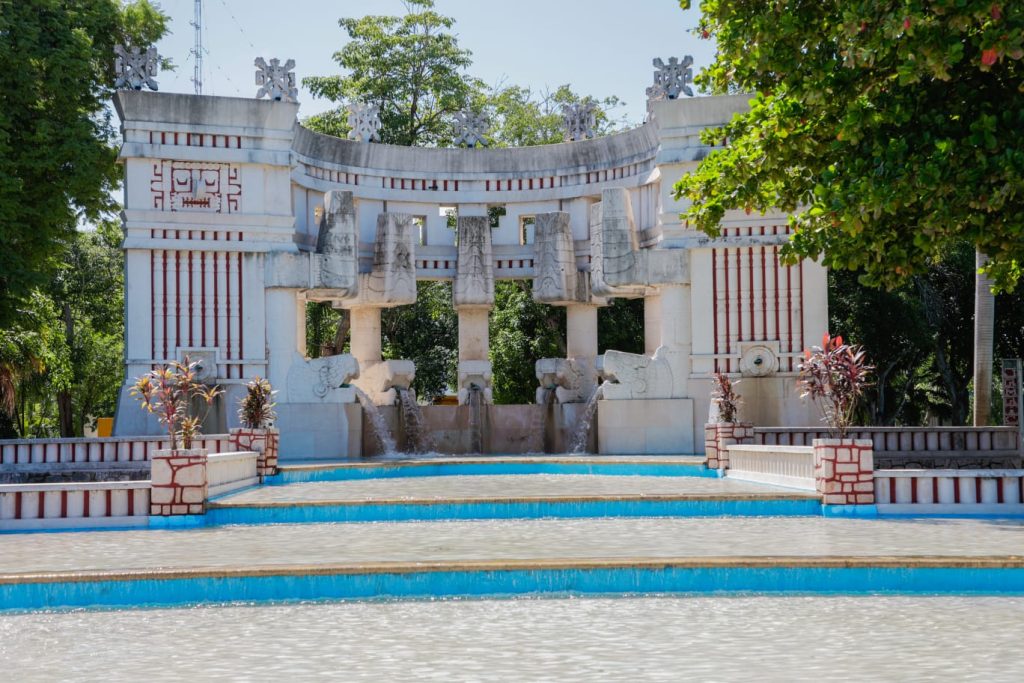 Acompañada de vecinos de la colonia García Ginerés, la presidenta municipal rindió un homenaje a la edificación de este emblemático parque en el que se hace referencia a la arquitectura monumental de la cultura maya y la identidad continental.