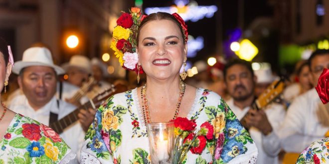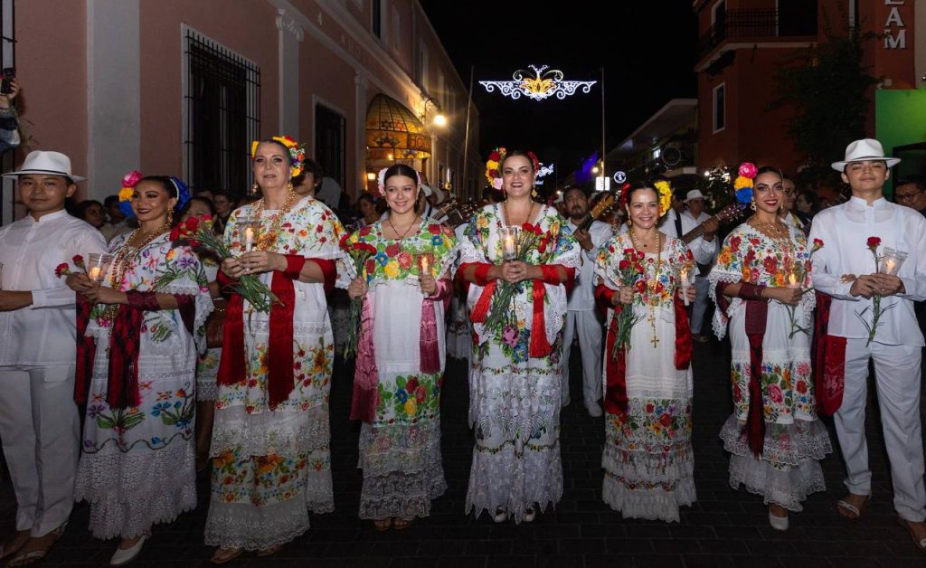 Portando con orgullo el traje regional de Yucatán, Cecilia Patrón encabezó la tradicional callejoneada que partió del parque de Santa Lucia hasta el Palacio Municipal.