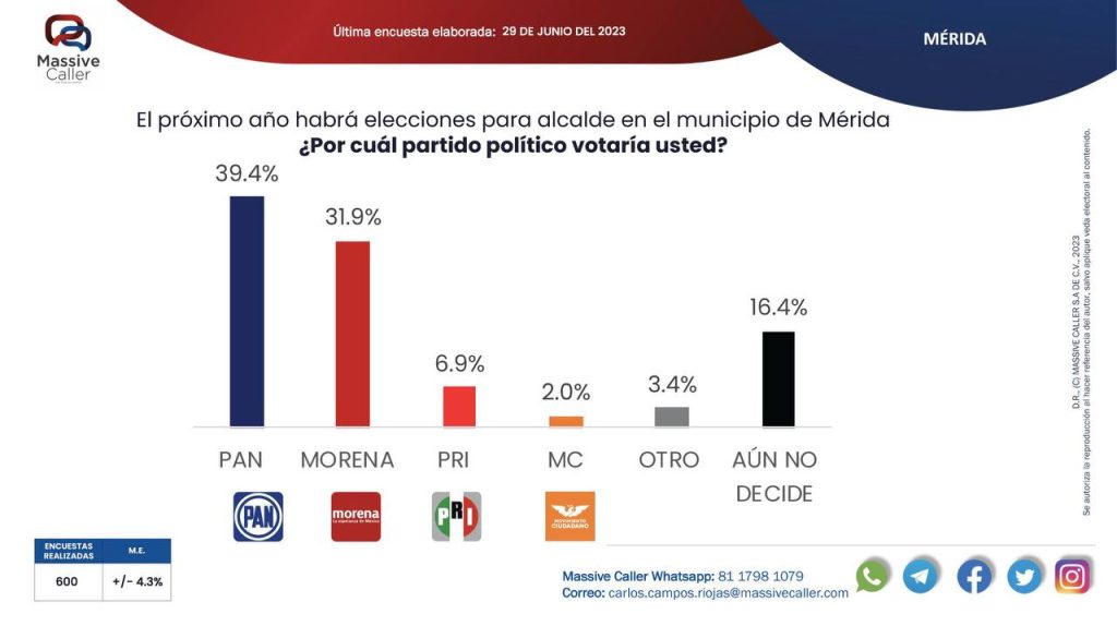 Finalmente, Massive Caller encuestó a 600 personas +/- 4.3% los cuales concordaron que el Partido Acción Nacional (PAN) ganaría Mérida con 39.4%, seguido de Morena 31.9%; PRI 6.9% y MC 2.9 %.