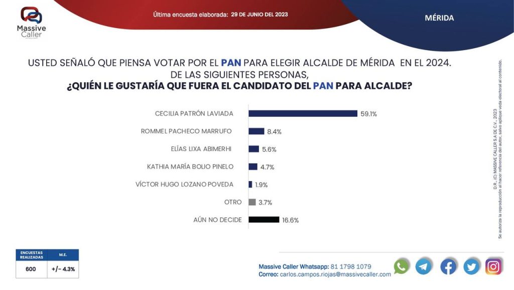 Mérida, Yuc., 07 de julio 2023.- La encuesta Massive Caller pone a la panista, Cecilia Patrón Laviada no solo como la idónea para ser la abanderada por la alcaldía de Mérida si no con una amplia ventaja para ganar Mérida.
