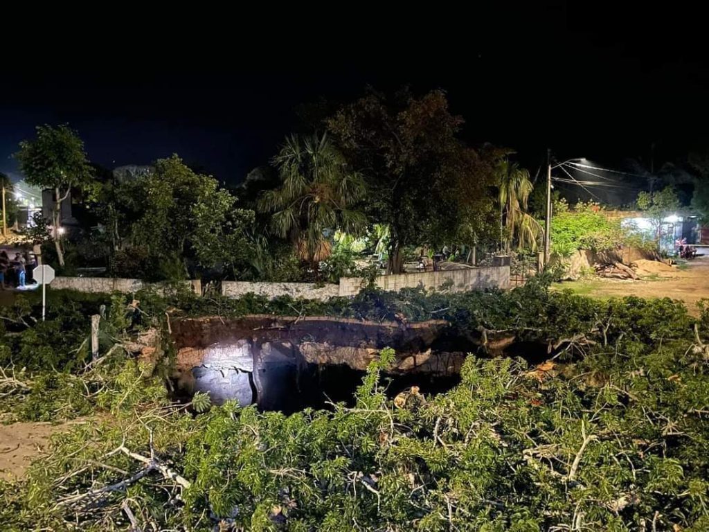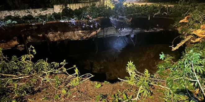 Valladolid, Yuc. a 05 de agosto.- Ayer por la noche en la calle 6 por 7 de la comisaría vallisoletana de Xocén, un árbol de ceibo de casi 3 metros de ancho y 15 metros de alto se cayó al fondo del cenote de esta comunidad, formando un socavón de aproximadamente 20 por 20 metros de diámetro.