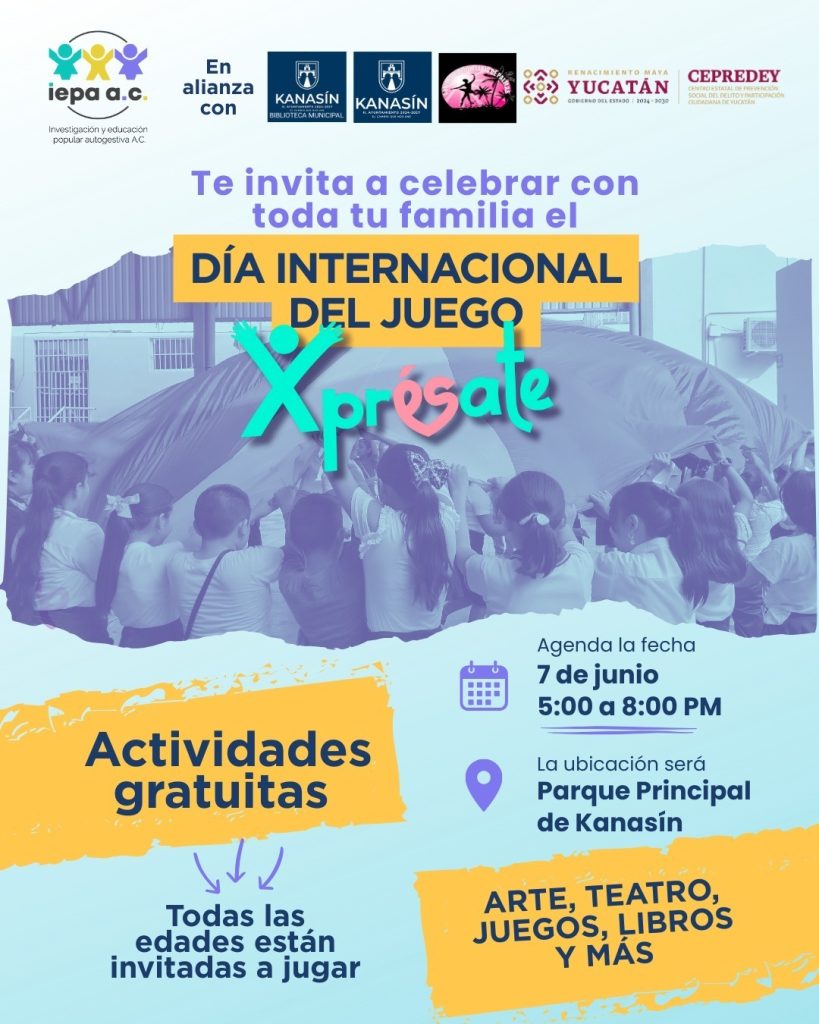 Mérida, Yucatán, a 6 de junio de 2025.- ¡Jugar también es un derecho! Para celebrarlo, el Centro Estatal de Prevención Social del Delito y Participación Ciudadana del Estado de Yucatán (CEPREDEY) se une al Día Internacional del Juego con la jornada “Xprésate”, que tendrá lugar este sábado 7 de junio, de 4:00 a 7:00 p.m., en el Parque Principal de Kanasín.