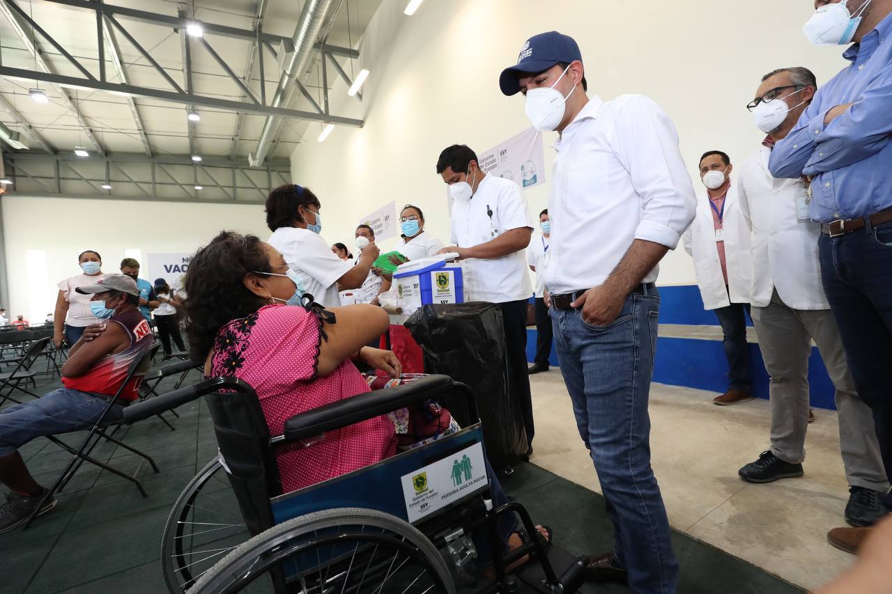 El Gobernador Mauricio Vila Dosal realizó una visita al módulo de vacunación habilitado en la Unidad Deportiva Villa Palmira para verificar el trabajo que realiza el personal de dependencias estatales así como federales, para permitir que este centro funcione de la mejor manera y con la adecuada atención para todos aquellos que acuden a vacunarse.