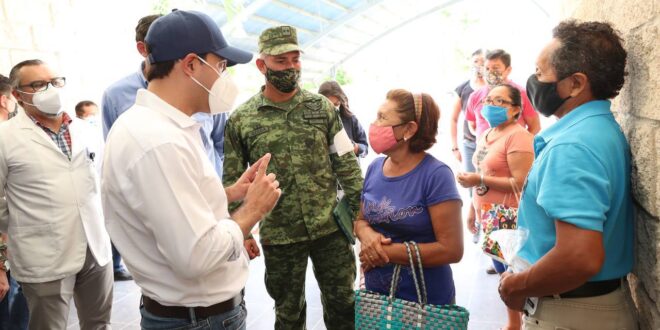 Durante el recorrido de supervisión en este centro de vacunación también estuvieron presentes el Teniente Coronel Javier Ojeda Beltrán Segundo, en representación de la X Región Militar y el subdirector de Salud Pública de la SSY, Carlos Isaac Hernández Fuentes.