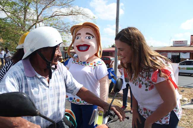 Al terminar su desayuno, la candidata se dirigió al poniente meridano, para entregar volantes en el cruce de las avenidas Mérida 2000 y Jacinto Canek, junto con el candidato del PAN-MC al 3er distrito local, Francisco “Chacho” Rodríguez, saludó y entregó folletos con su información, ahí se se subió a un autobús de pasajeros, en una moto y hasta en un tráiler para saludar a todos.