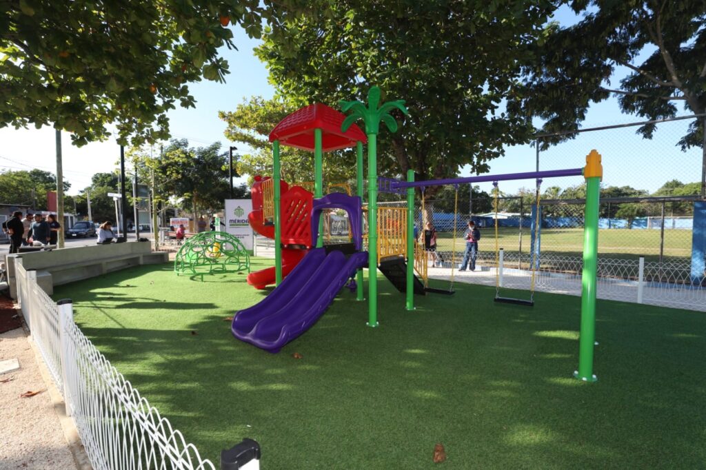 De igual forma, el área infantil del Parque de San Pedro Uxmal fue intervenida en más de 4 mil metros cuadrados, con trabajos de demolición, restauración de juegos, colocación de pasto sintético, mejora de bancas y mesas, así como la instalación de infraestructura segura y funcional para las infancias.