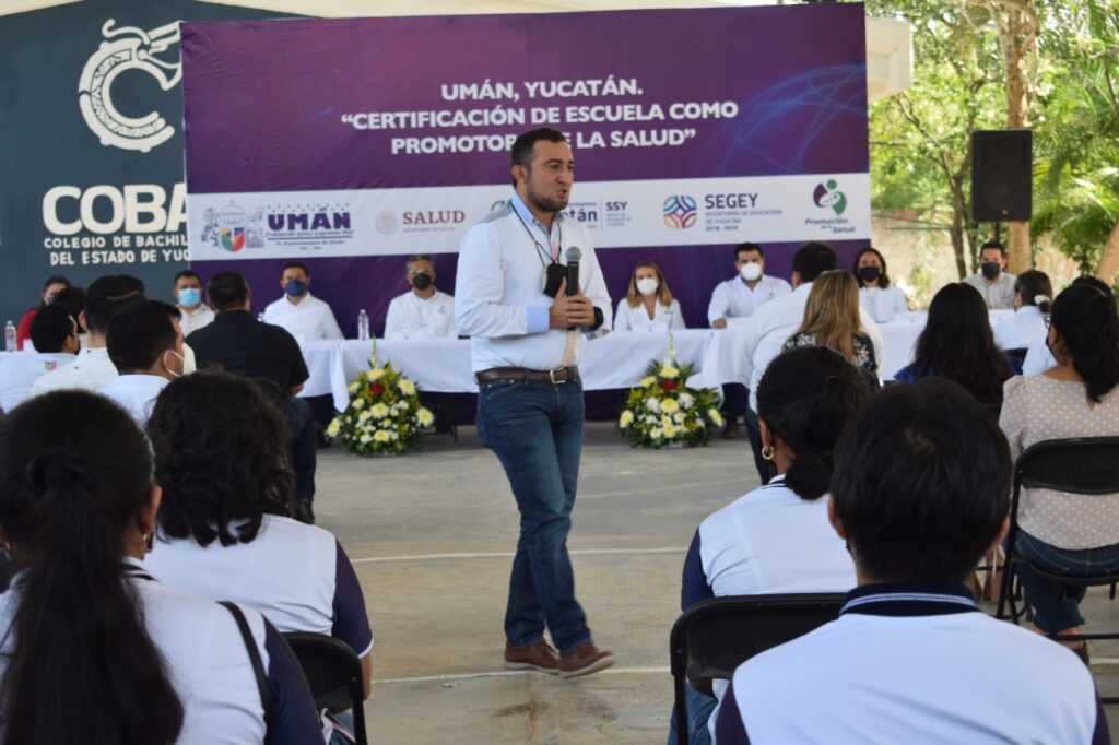 Por su parte, Erwin Pacheco López, director del Cobay Umán, dijo que esta certificación es gracias a la suma de esfuerzos del Ayuntamiento, Gobierno del Estado, el Centro de Salud Urbano de Umán, personal docente y administrativo, estudiantes y padres de familia que contribuyeron con acciones de limpieza, desbroce, pintura, fumigación y rehabilitación de baños, así como tutorías de prevención de adicciones, embarazos a temprana edad, suicidio y acoso escolar por medio de conferencias, talleres y campañas.