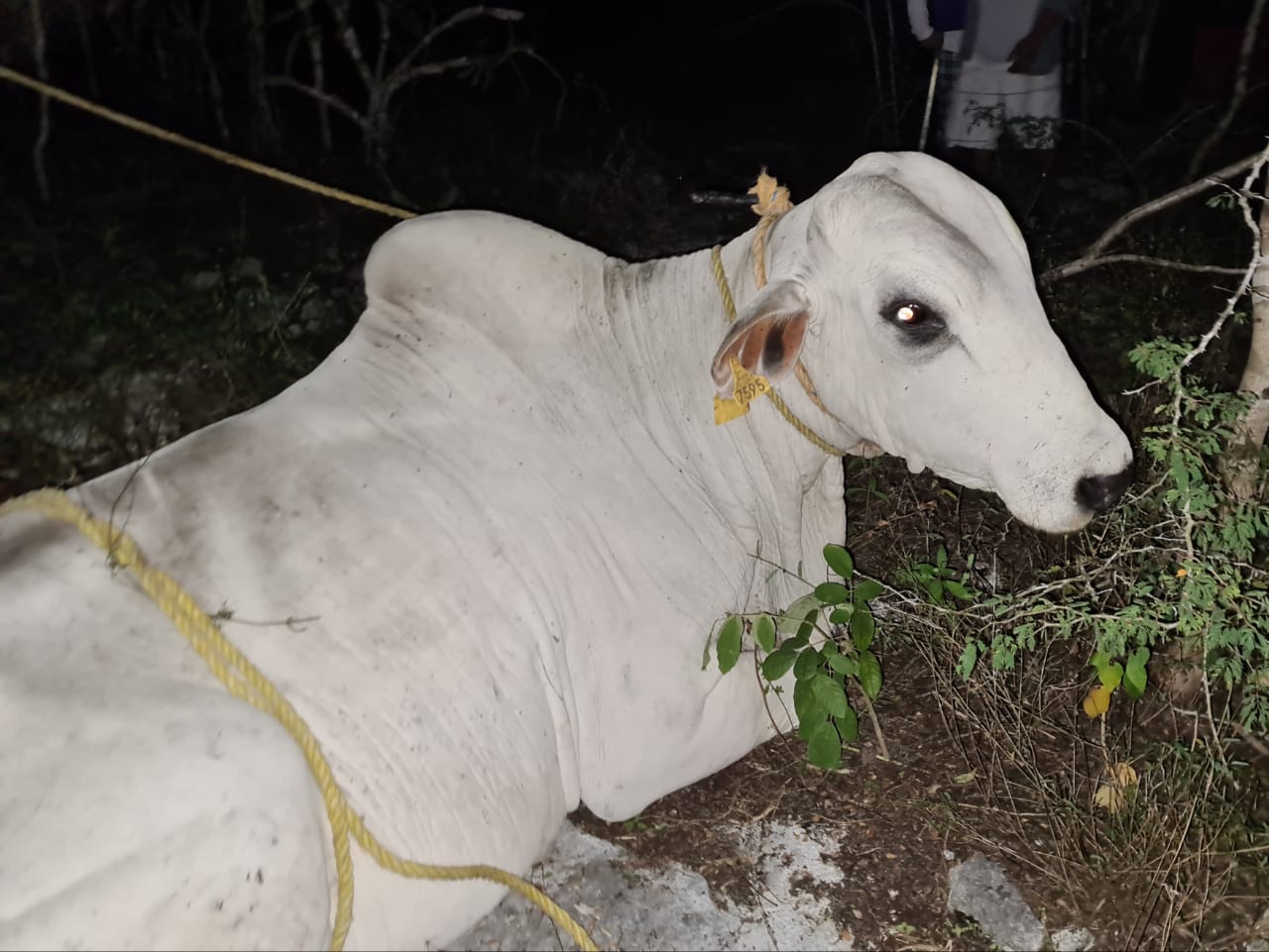 Desafortunamente la res se metió en el arrollo de circulación para ser chocada por una unidad Dodge Ram con matrícula YN-0815-B, que manejaba Jesús Alberto Yamá Solís, donde llevaba en la cama a varios albañiles con destino a Kinchil.